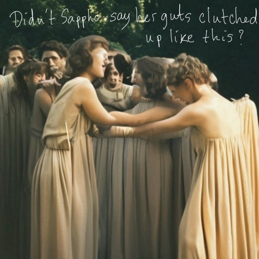 AI generated images that I produced as a visual translation of Marilyn Hacker’s poem “Didn’t Sappho Say Her Guts Clutched Up Like This?”